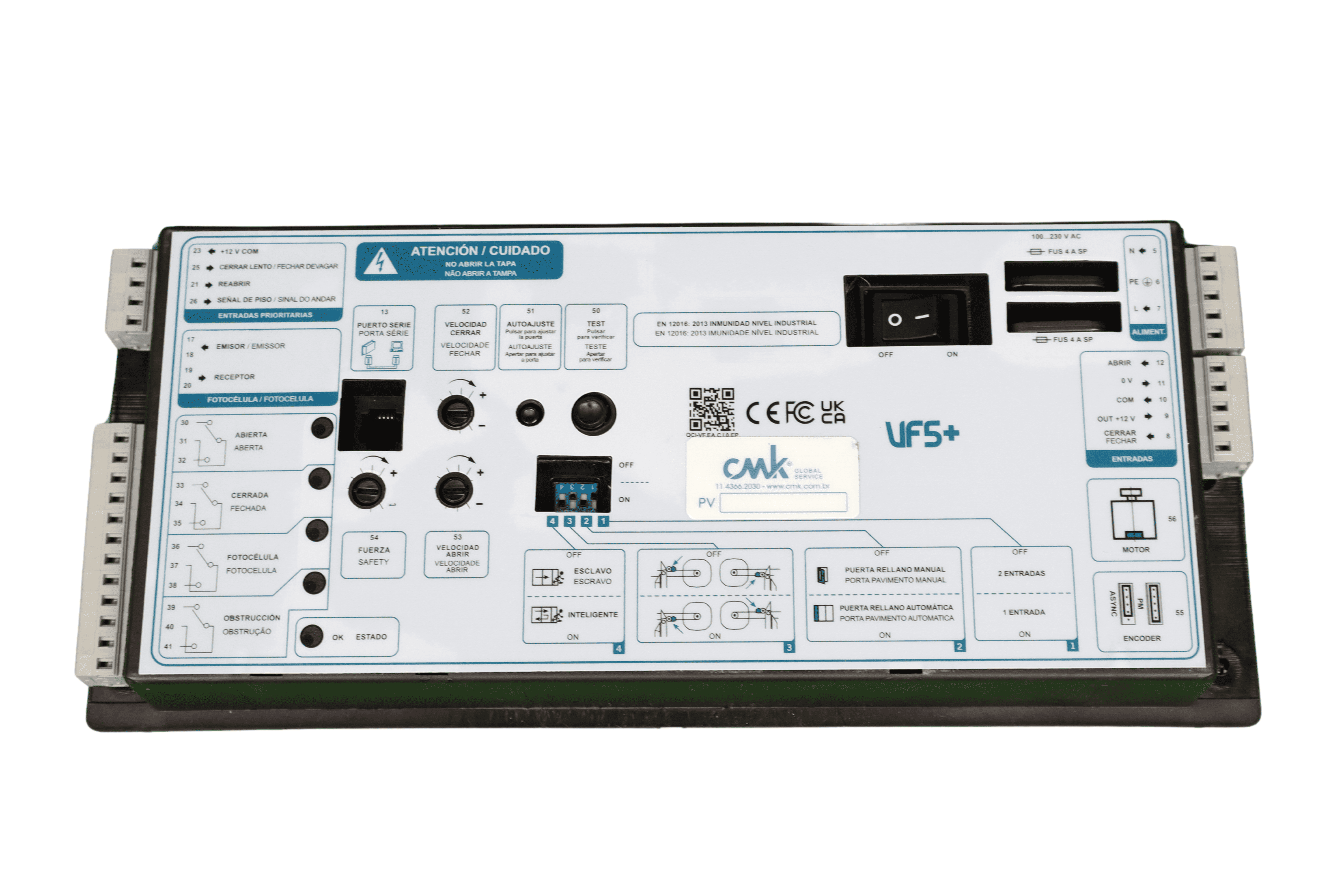 A segurança é fundamental e o Fermator VF5+ oferece. Equipado com recursos de segurança de ponta, o inversor garante uma operação de porta segura e controlada. O sistema de detecção de obstáculos embutido evita acidentes detectando obstruções na porta, enquanto a função de parada de emergência fornece uma camada adicional de proteção. Tenha certeza, o VF5+ está em conformidade com os mais recentes padrões de segurança, dando a você tranqüilidade.